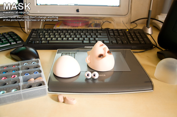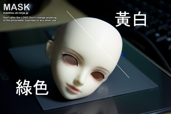 打開頭蓋後,裡面是粉色的,這是SDF的原色。嘗試打磨臉蛋發青的部位,看看磨掉一層會否有改善,要磨到像腦殼裡那種粉色是不可能的啦^^b,看了下頭蓋結合處橫切面,那層綠色已經是厚厚一層的變色。打磨後可以去掉綠色,呈現的是比黃普要淺有點發青的白,要普肌素體它又太青,要白肌素體它又會黃,真微妙。